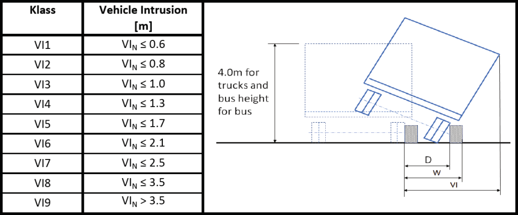 normally 4 m above ground, to prevent the colliding vehicle from bumping into the object protected by the barrier. Vehicle intrusion VI is measured from the traffic face of the barrier and is declared for high containment (H1-H4 och L1-L4) barriers only.