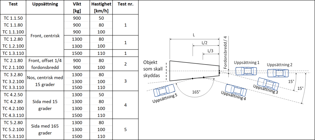 Test med uppsättning 4 och 5 utförs endast för krockdämpare av typen avledande (redirective) vilket är ett krav i Sverige.
